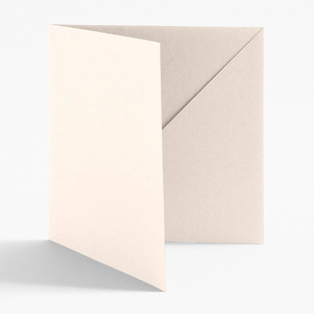 The perfect square folder with a unique diagonal pocket. Add your invitation and insert smaller cards (response card, map, etc.) into the pocket. Classic to use as it is but also a perfect canvas for creativity. Decorate with paper, photos, ribbon, or rubber stamps. Made for us in Italy, our luxe cream paper is a lovely soft, warm and traditional with 25% cotton. It has a lovely texture that just whispers quality. Fits into our 5 3/4 square envelopes.