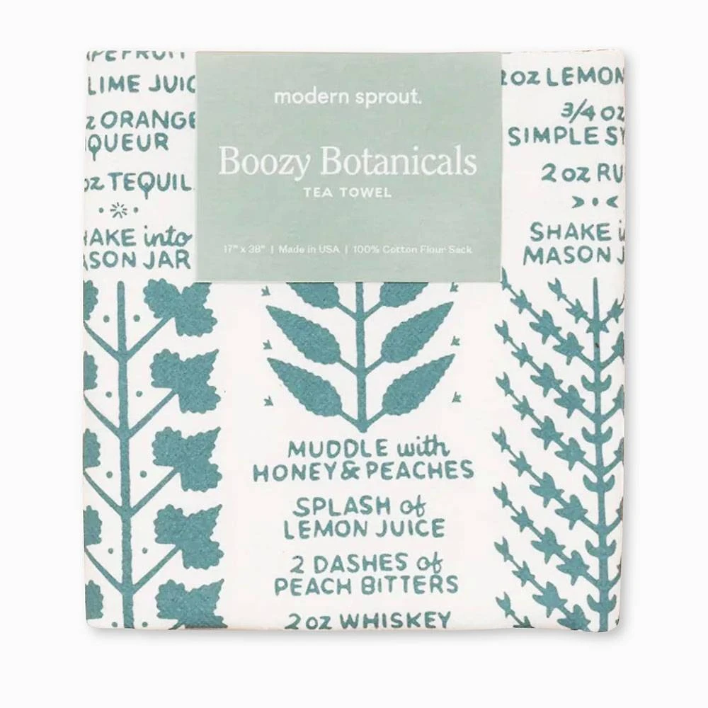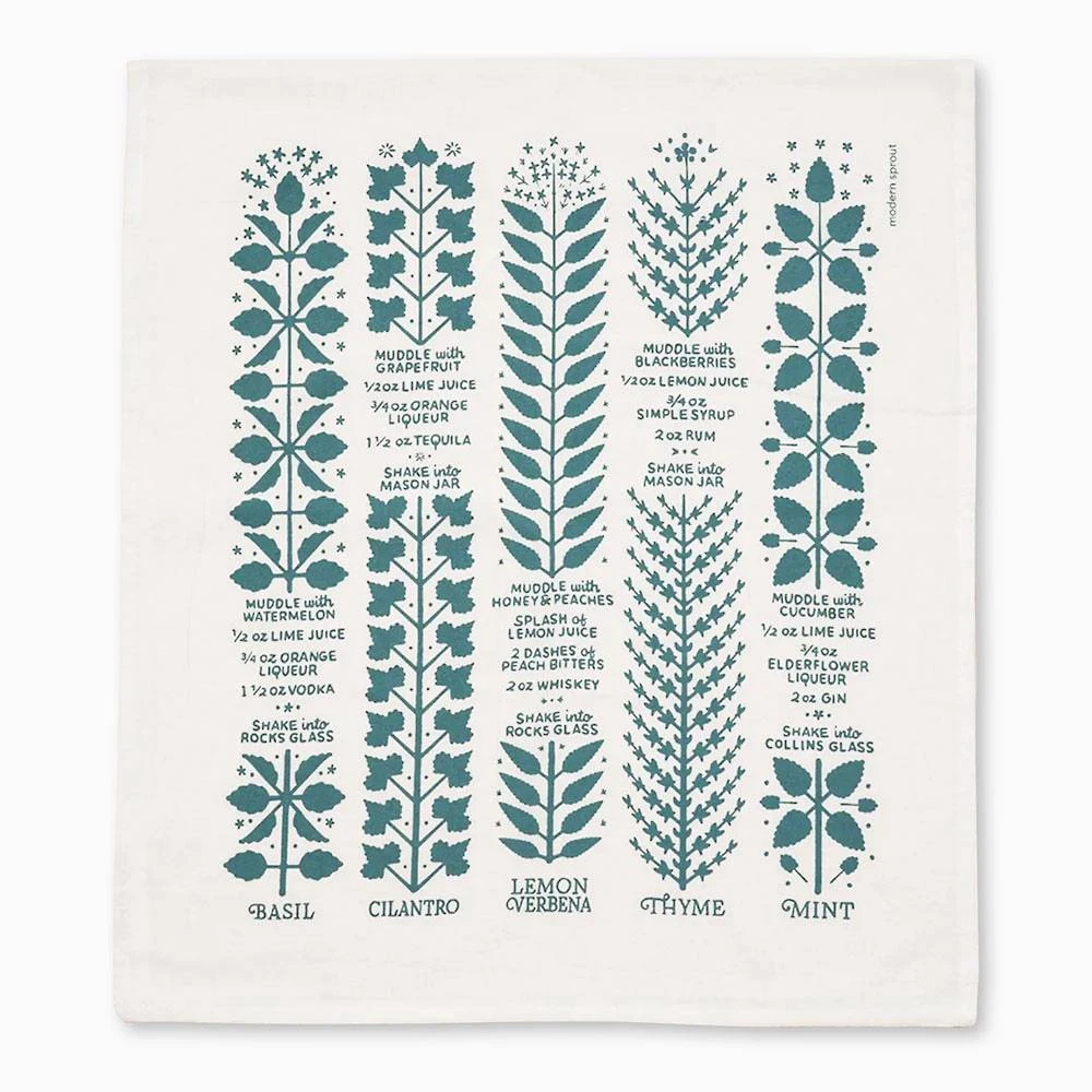 Oversized, 100% cotton flour sack towel features a Scandinavian-inspired design highlighting five muddle-worthy herbs (basil, cilantro, lemon verbena, thyme, and mint) and recipes for complimentary cocktails.