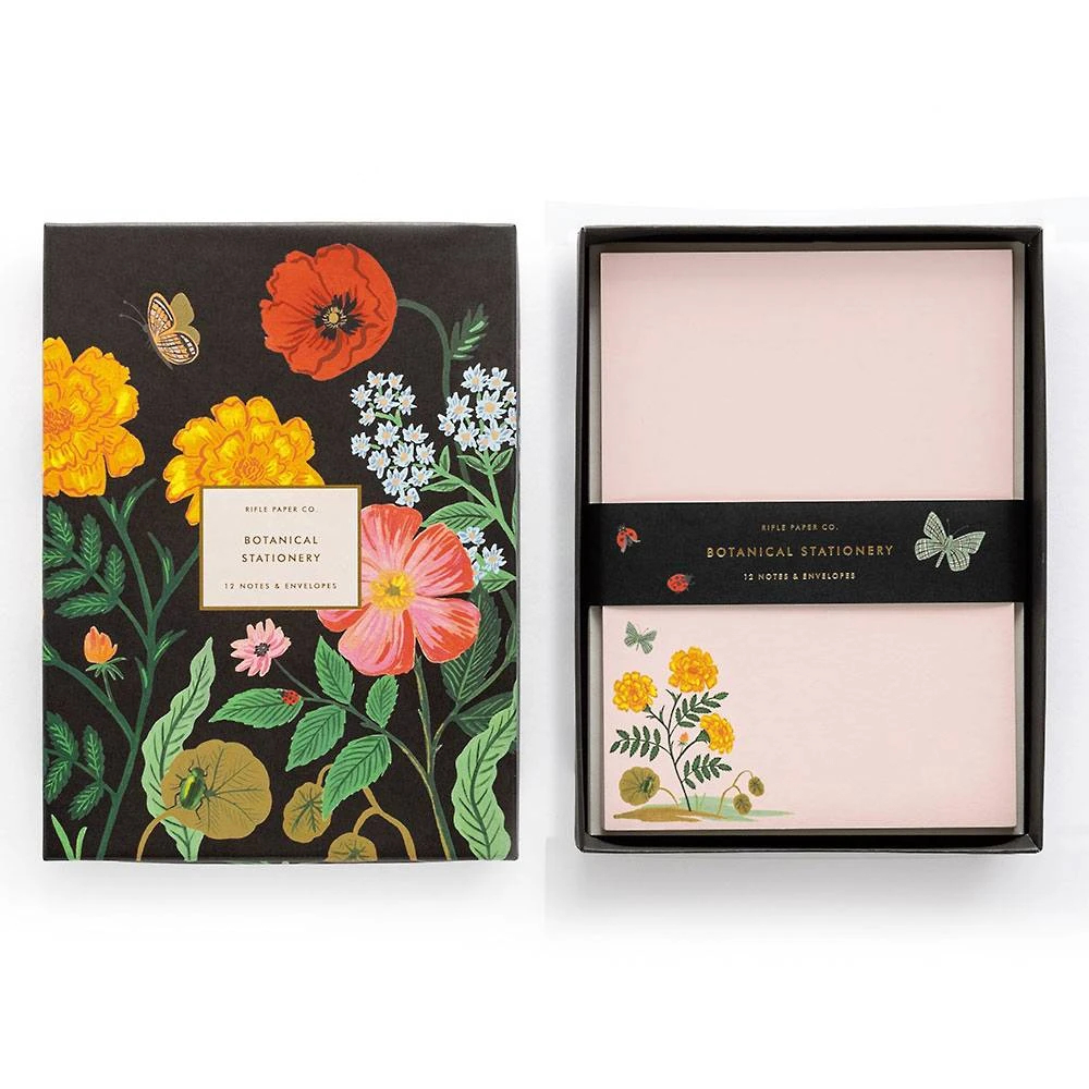 For thank yous, greetings, and everything in between, this stationery set includes 12 cover-weight flat notes with full-color designs on the back. Each set comes with a four-count of three different designs and envelopes inside a matching box. By Rifle Paper Co.