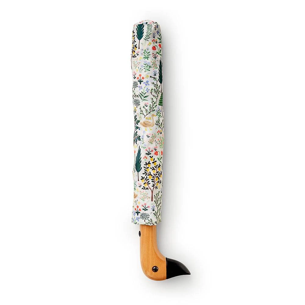 Full-color illustrated umbrella that folds up to a portable size, with matching storage sleeve, embossed logo button, and wrist strap. This particular design features a wooden duck handle and an auto-open feature. By Rifle Paper Co.