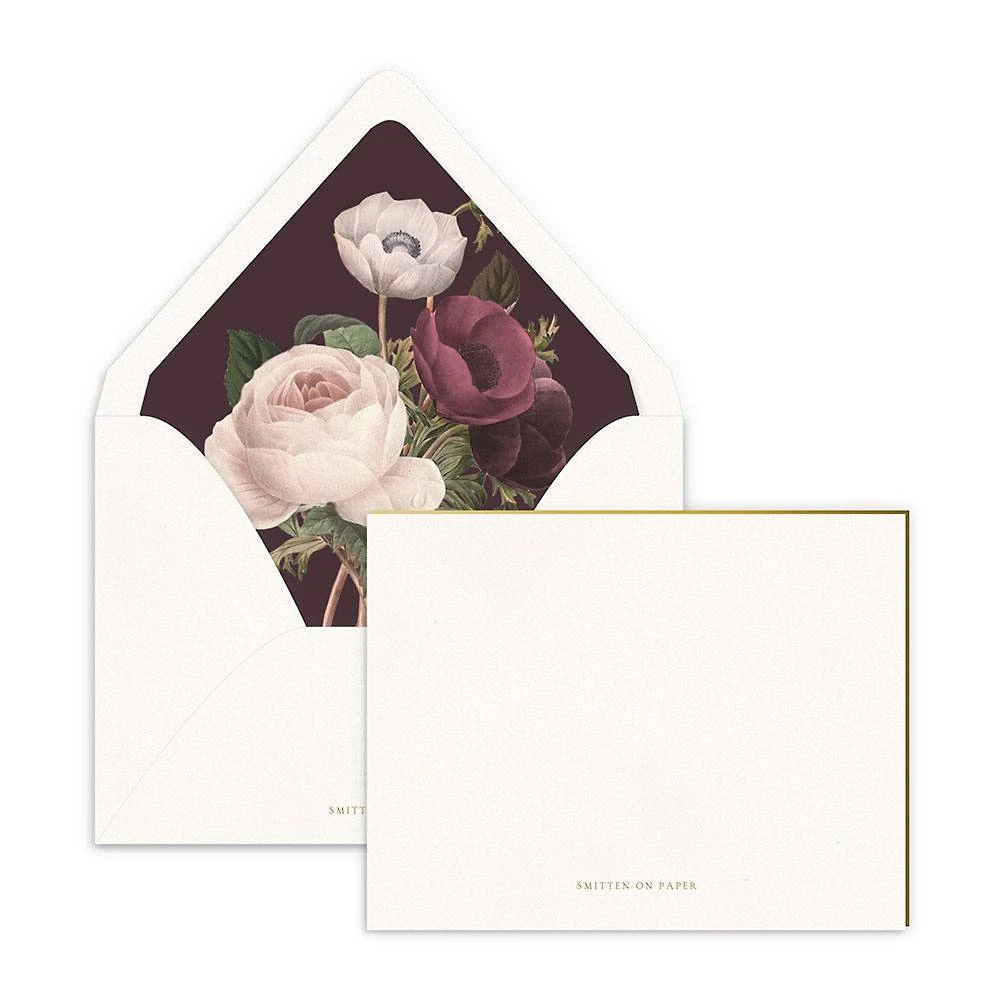 These beautiful luxe cards are ideal for sending messages to your loved ones. This set features beautifully lined envelopes with a stunning peony design. Includes gold foil accents.