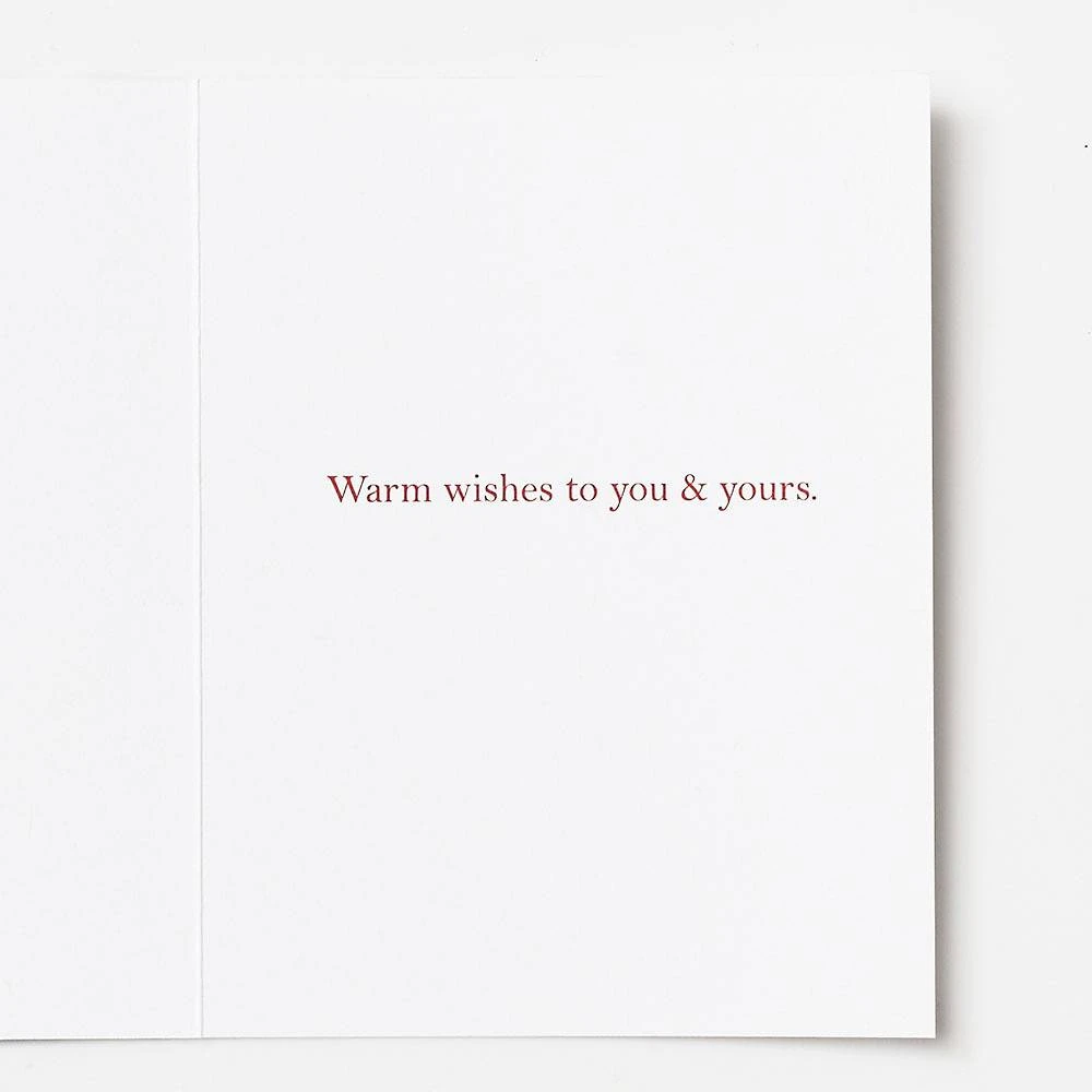 A cozy fox dresses in a fuzzy scarf and is framed by pine on these lovely holiday notecards. Outside message reads: happy holidays. Inside message reads: “Warm wishes to you and yours.” Accompanied with matching kraft envelopes. By Paper Source.