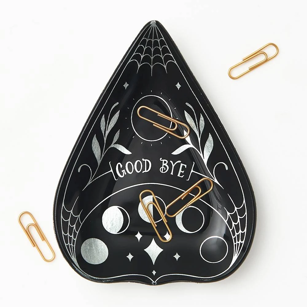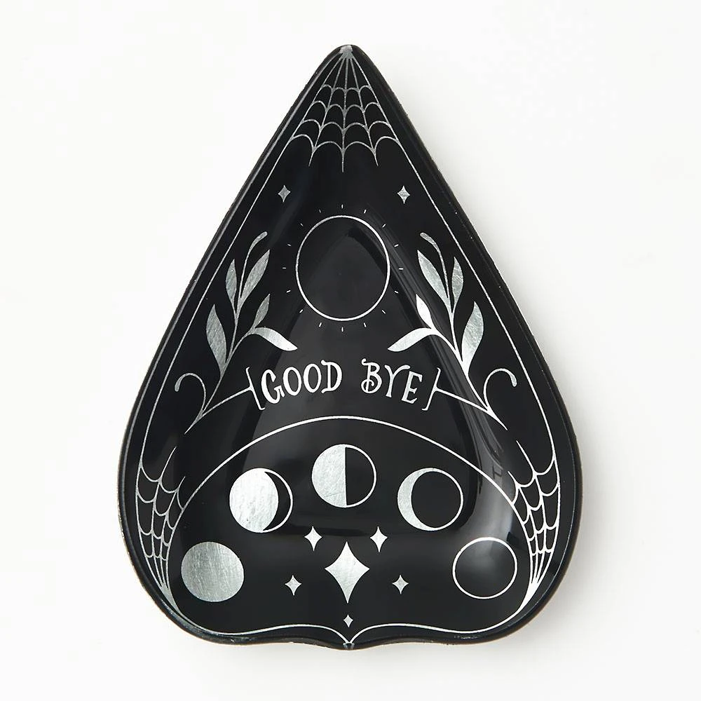 A spooky décor piece for any season, our Oujia Trinket Dish is made of glass and features classic spirit board phrases.