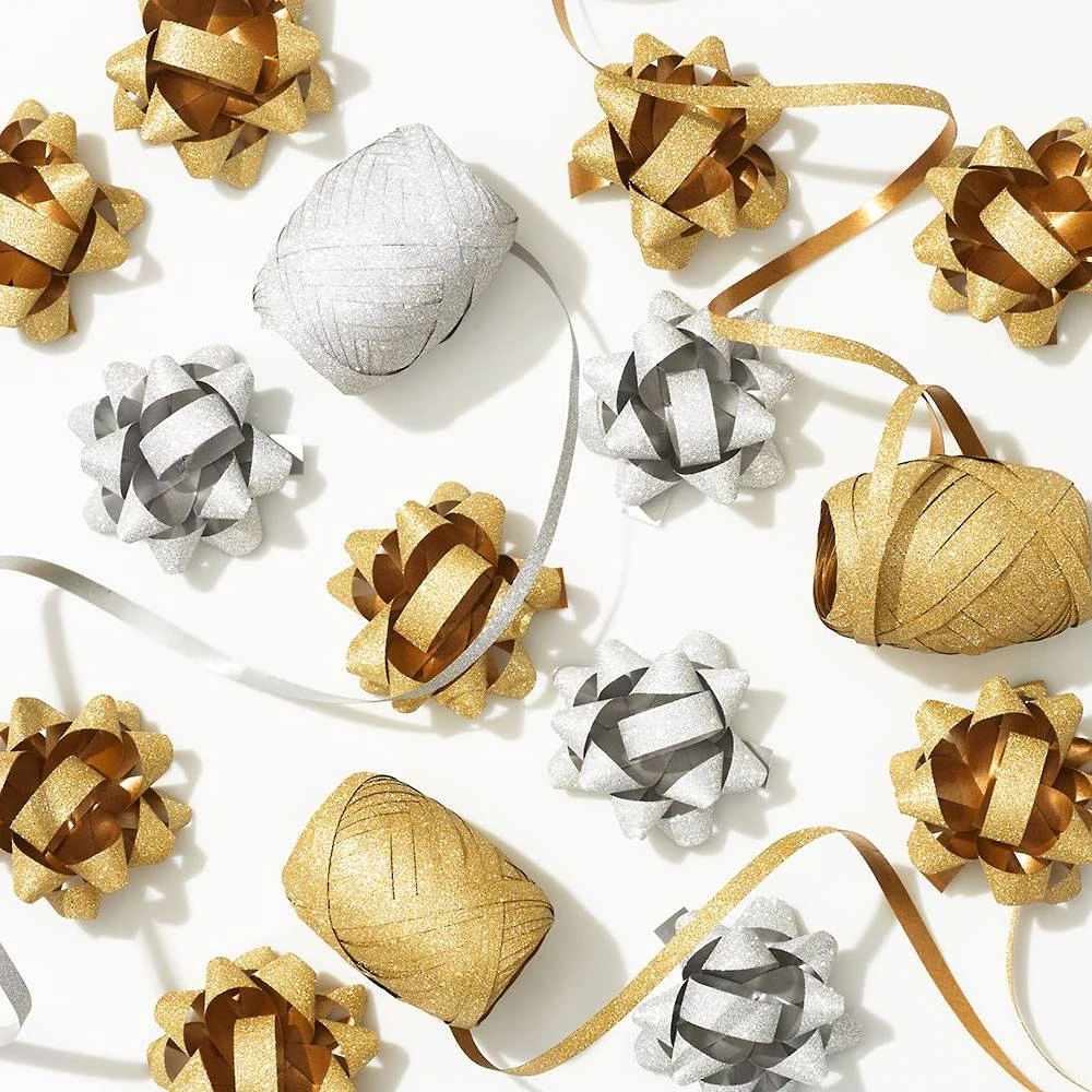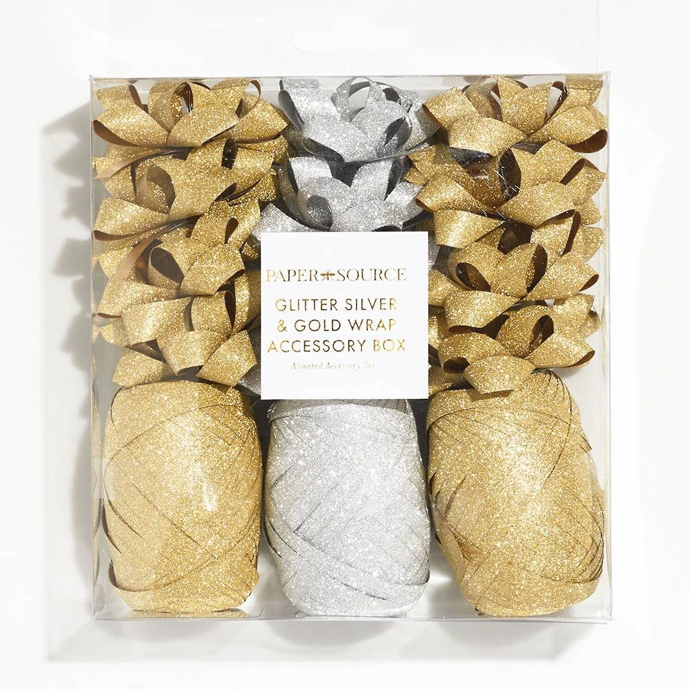 Grab this gift wrap finishing box as a one stop shop for everything needed to complete a wrap project! This set features silver and gold glitter for a luxe touch!