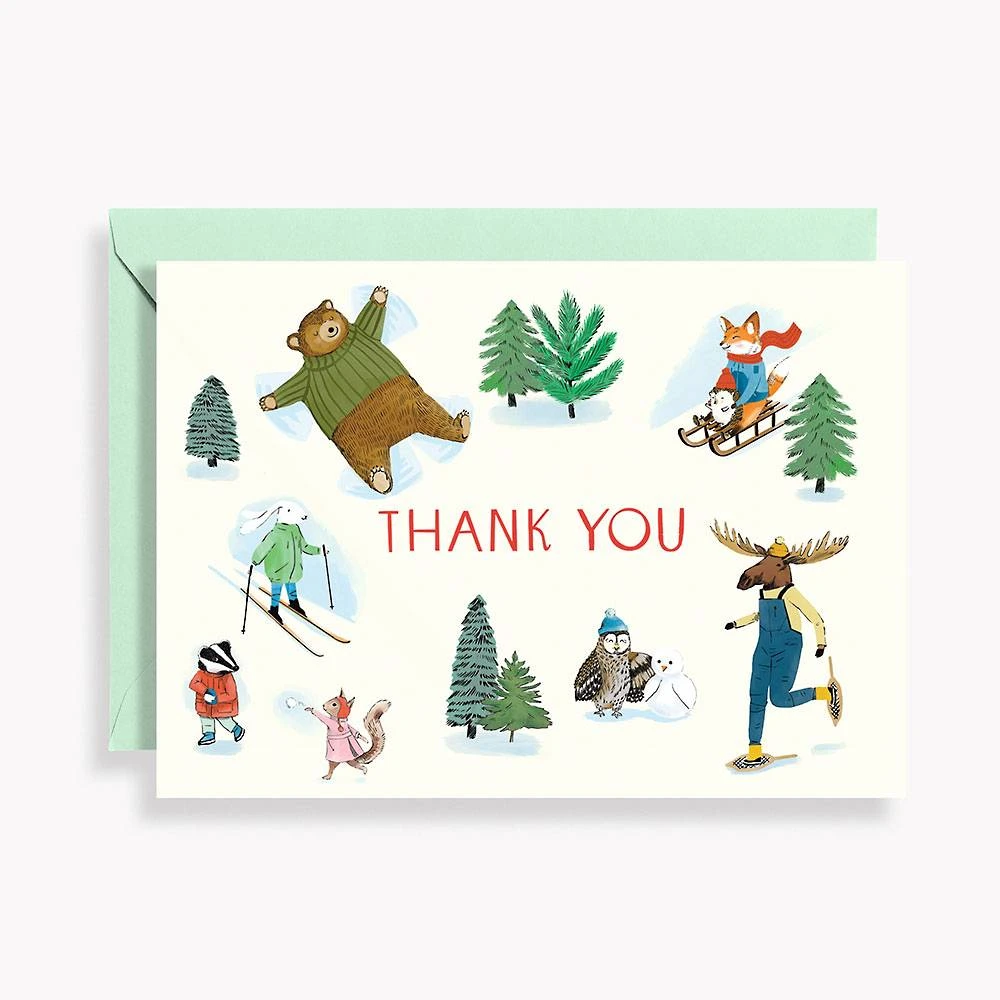 Say thank you with these cute cards! Features adorable critters playing in the snow.