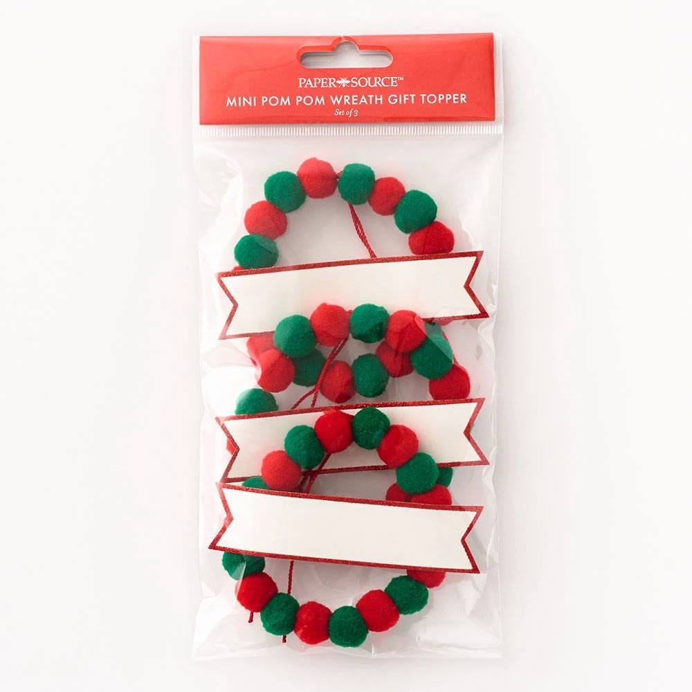 Add an extra special touch to your gifts this holiday with our set of three pom pom wreath gift toppers. Inside the wreath is a tag with ample space to write!