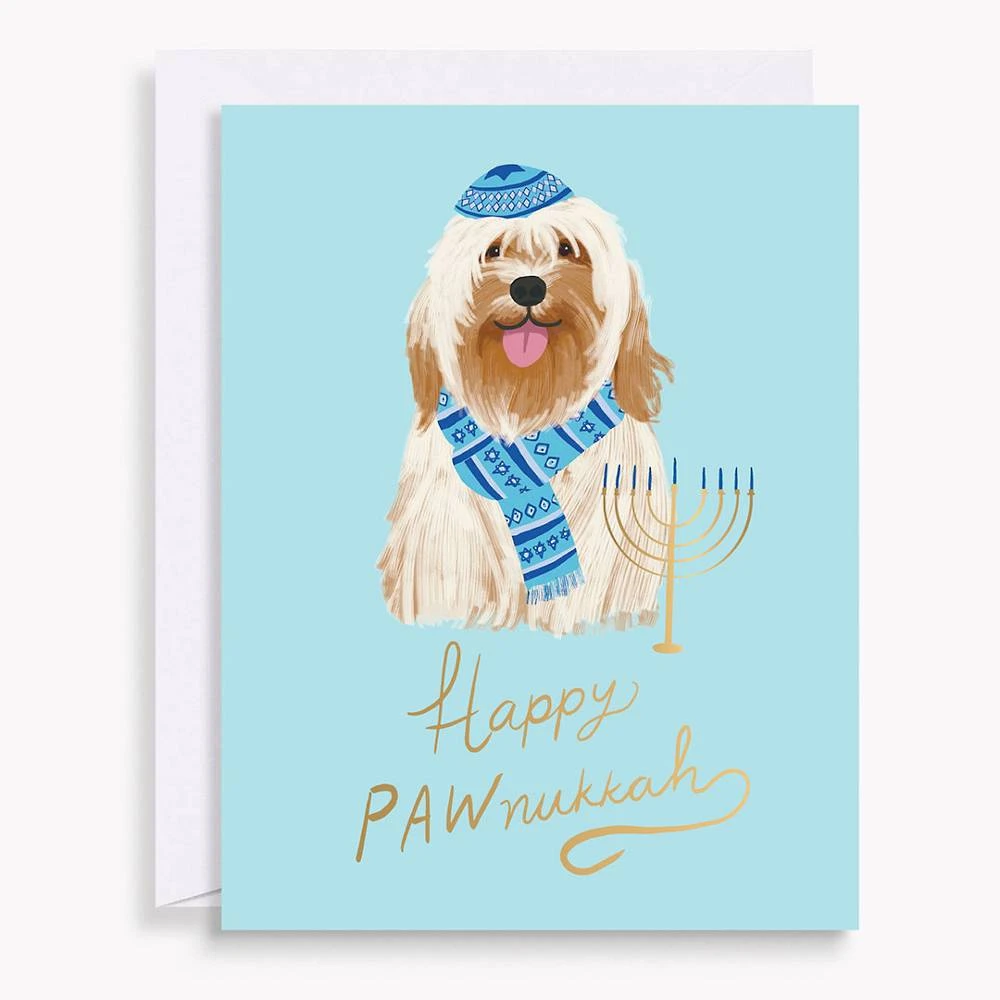 This good boy is excited to celebrate the season! Send these Hanukkah cards to family and friends featuring cute Hanukkah dog. Cards read, “Happy paw-nukkah.”