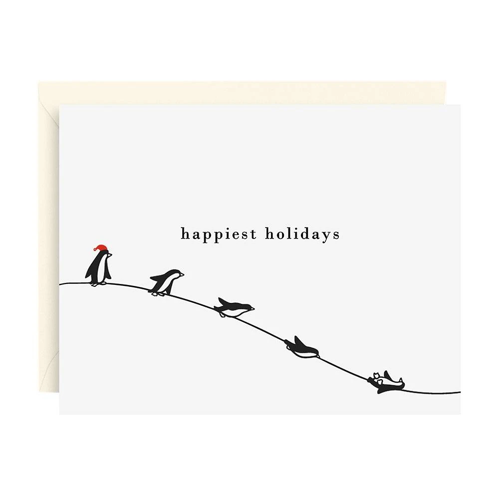These charming little penguins are a darling way to send seasonal cheer. Front of card reads, “Happiest Holidays!” Letterpressed. Blank inside. Paired with luxe white envelopes. Designed by Paper Source.