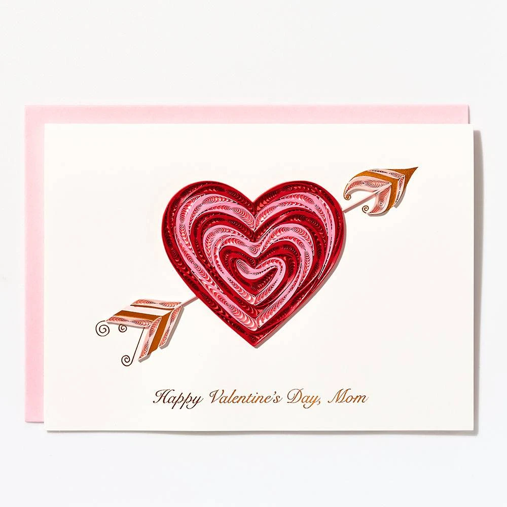 Send a heart-filled message to your mother with this beautiful card! Using intricate handcrafted technique, card features a heart with arrow design. Card reads, “Happy Valentine’s Day, Mom!”