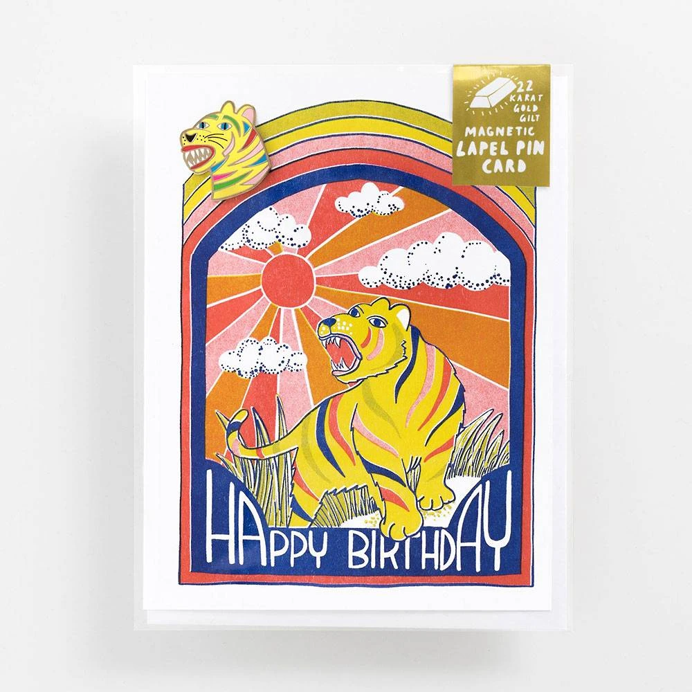 Send roaring birthday wishes with this bright card! Card is Risograph printed in brilliant color and includes a fierce 22-karat gold gilt magnetic lapel pin. Blank inside. Paired with coordinating envelope. By Yellow Owl Workshop.