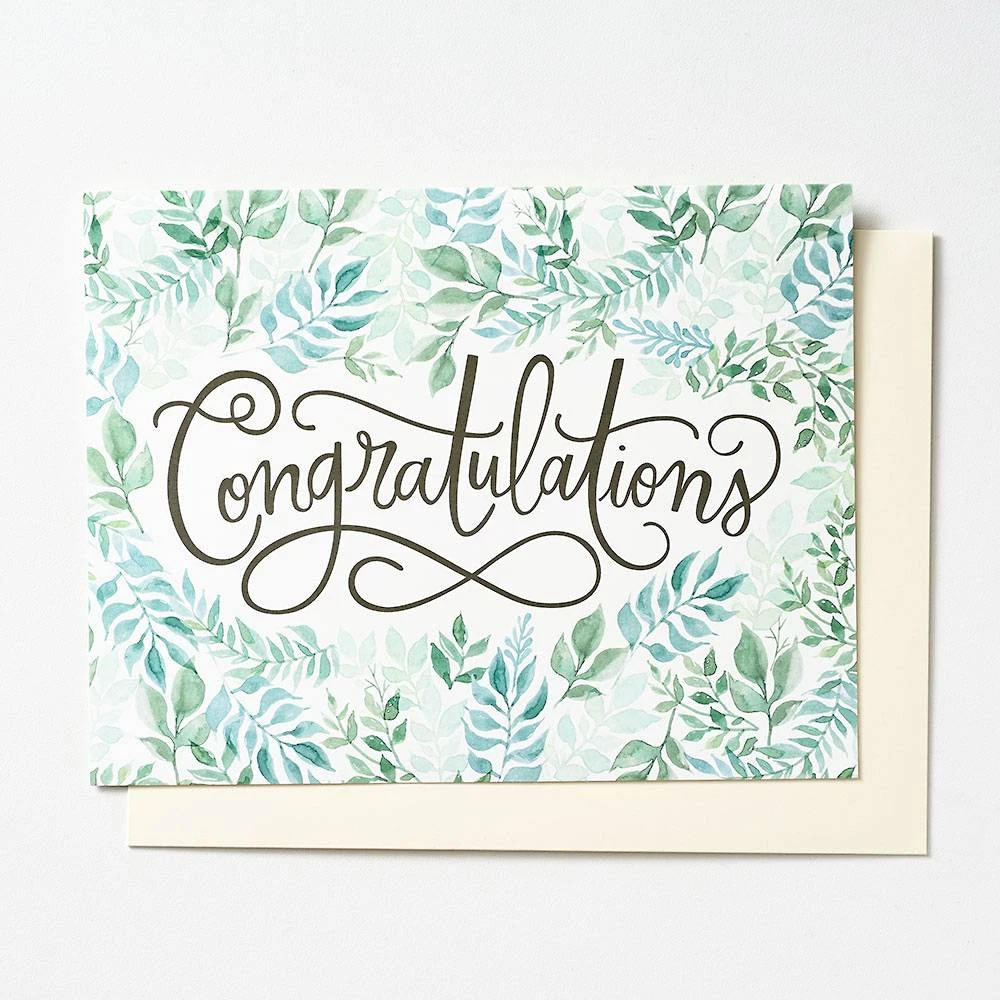 This big card is great for large offices or a big group of family or friends to share sweet messages of congrats! Front of card features watercolor green leaves and reads “Congratulations” in the center in black script.