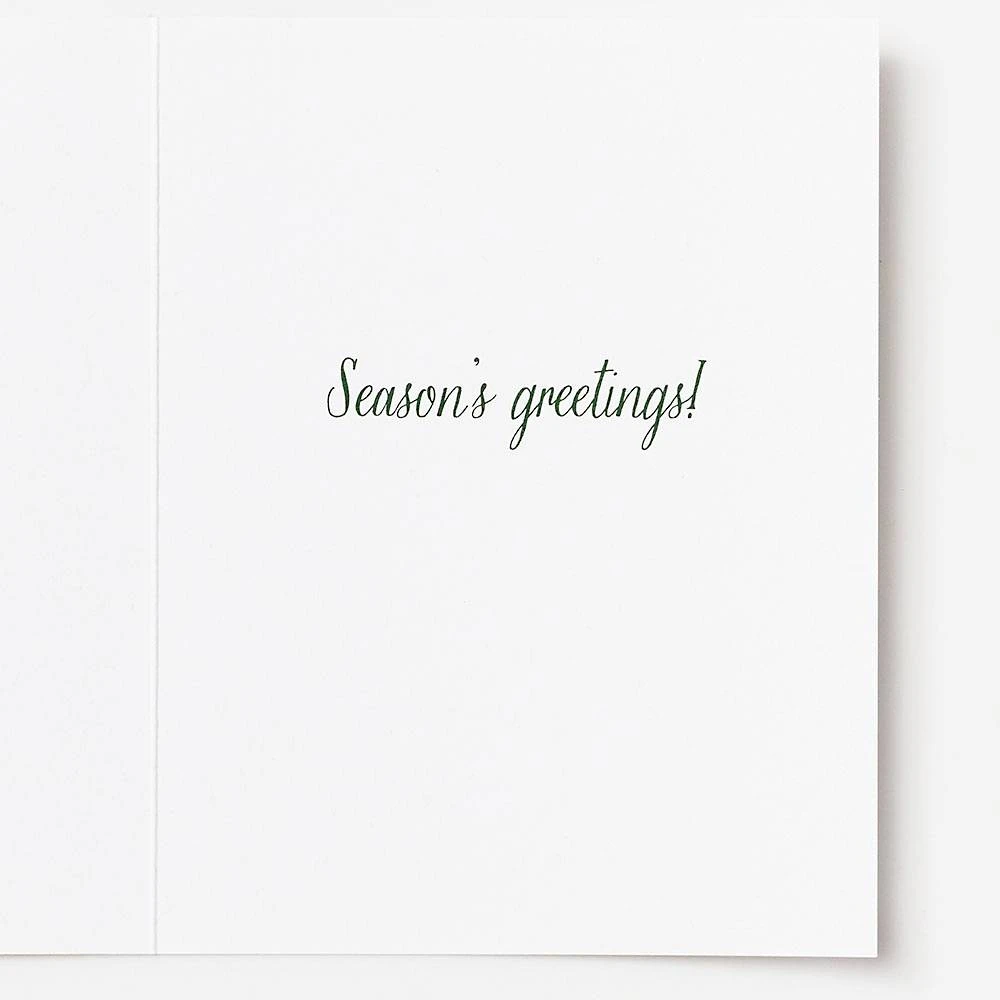 Beautiful watercolor painted ornaments with gold foil details are featured on this lovely Christmas stationery. Outside message reads: “Wishing you a bright and joyous holiday season!” Inside message reads: “Season’s greetings!” Accompanied with matching red envelopes. By Paper Source.