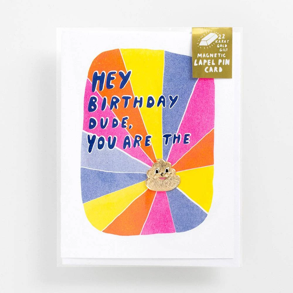 Let the birthday dude hear how awesome they are! Card is Risograph printed in brilliant color and includes a 22-karat gold gilt magnetic lapel pin. Blank inside. Paired with coordinating envelope. By Yellow Owl Workshop.